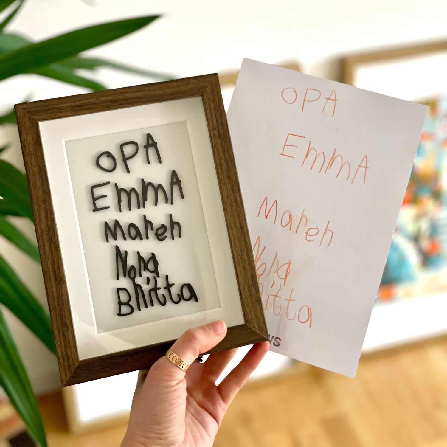 Zunächst wählst du die Rahmengröße und -farbe aus und schließt die Bestellung ab. Anschließend erhältst du von uns eine E-Mail mit einer Druckvorlage als Hilfestellung, die du auf einem DIN-A4-Papier ausdrucken kannst. In der eingezeichneten Kritzelbox kannst du dein persönliches Design mit einem dicken Filzstift erstellen. Danach fotografierst oder scannst du dein Werk und sendest es uns zurück. Wenn dein Werk auf einem alten Brief, einer Skizze oder einem weniger gut lesbaren Dokument basiert, bereiten wir es kostenfrei für dich auf. Schicke uns einfach alles, was wir hierfür brauchen, per Mail. Wir bearbeiten dein Kunstwerk, bereiten es in einer 3D-Software auf und starten den Druckprozess.