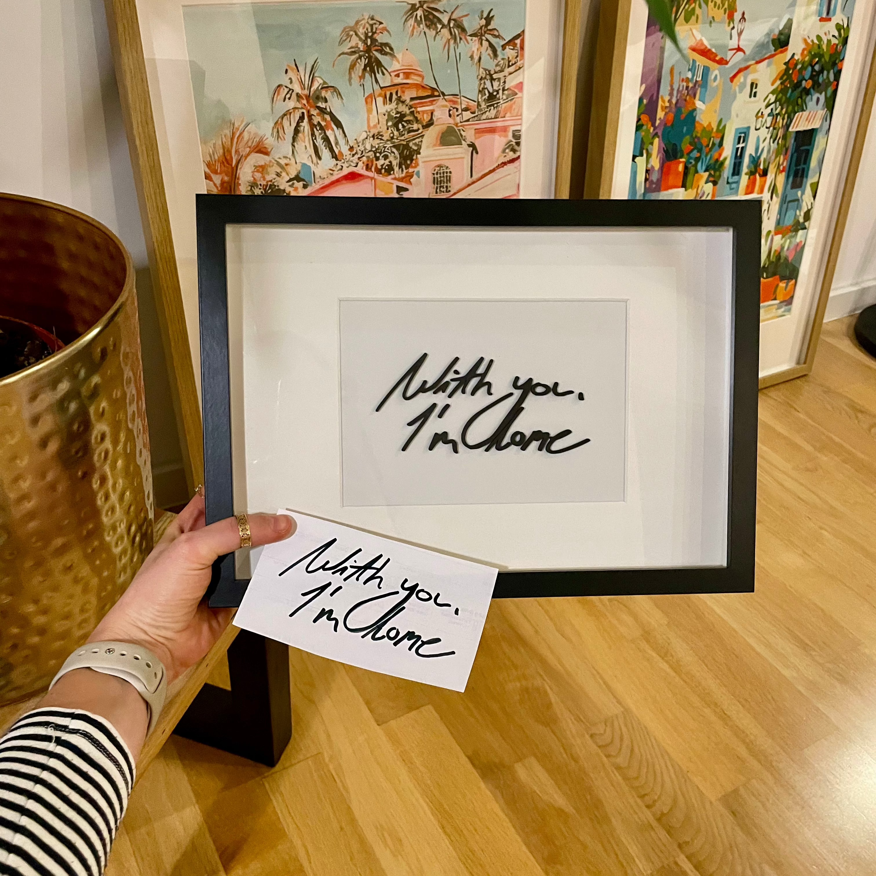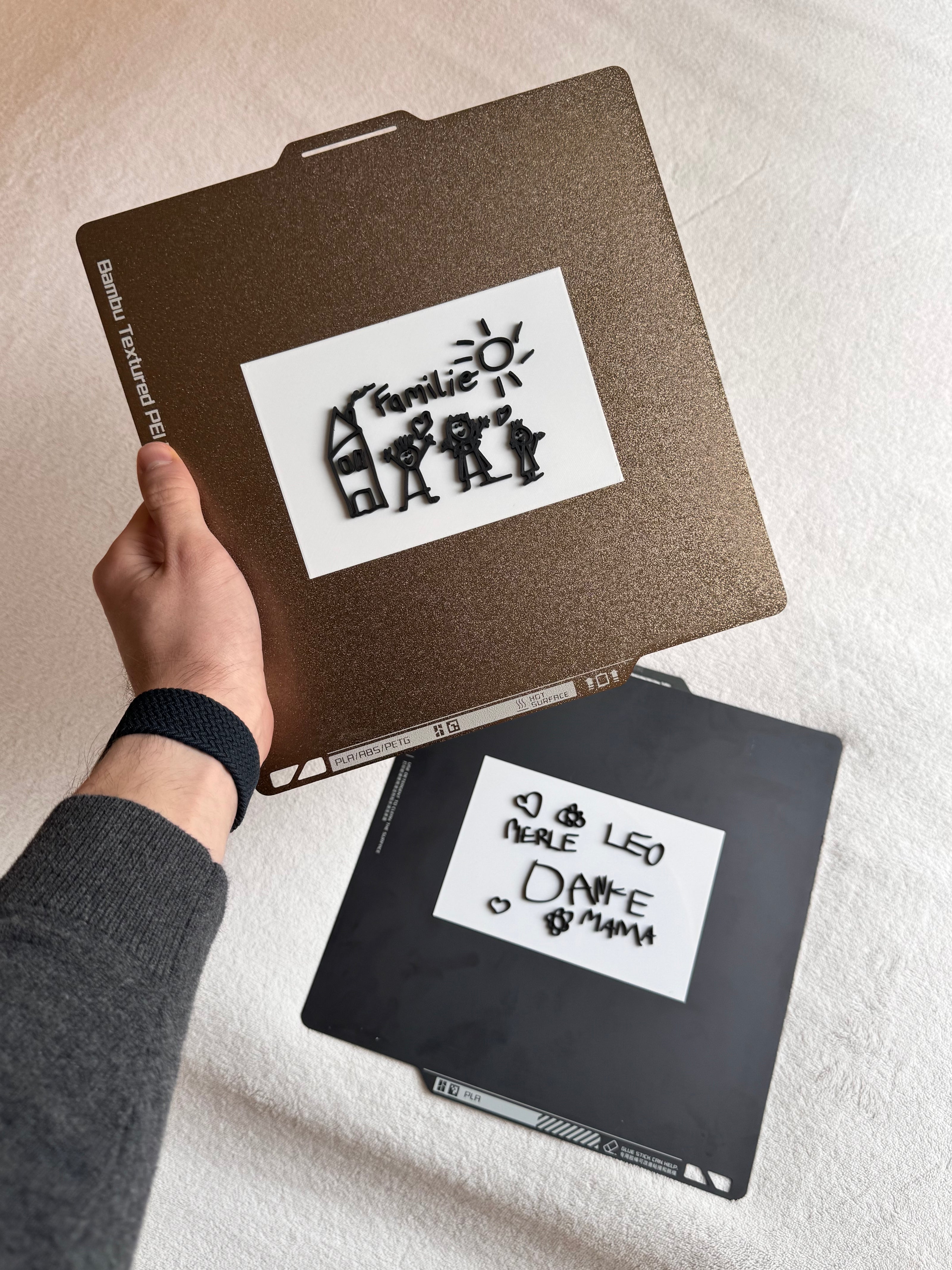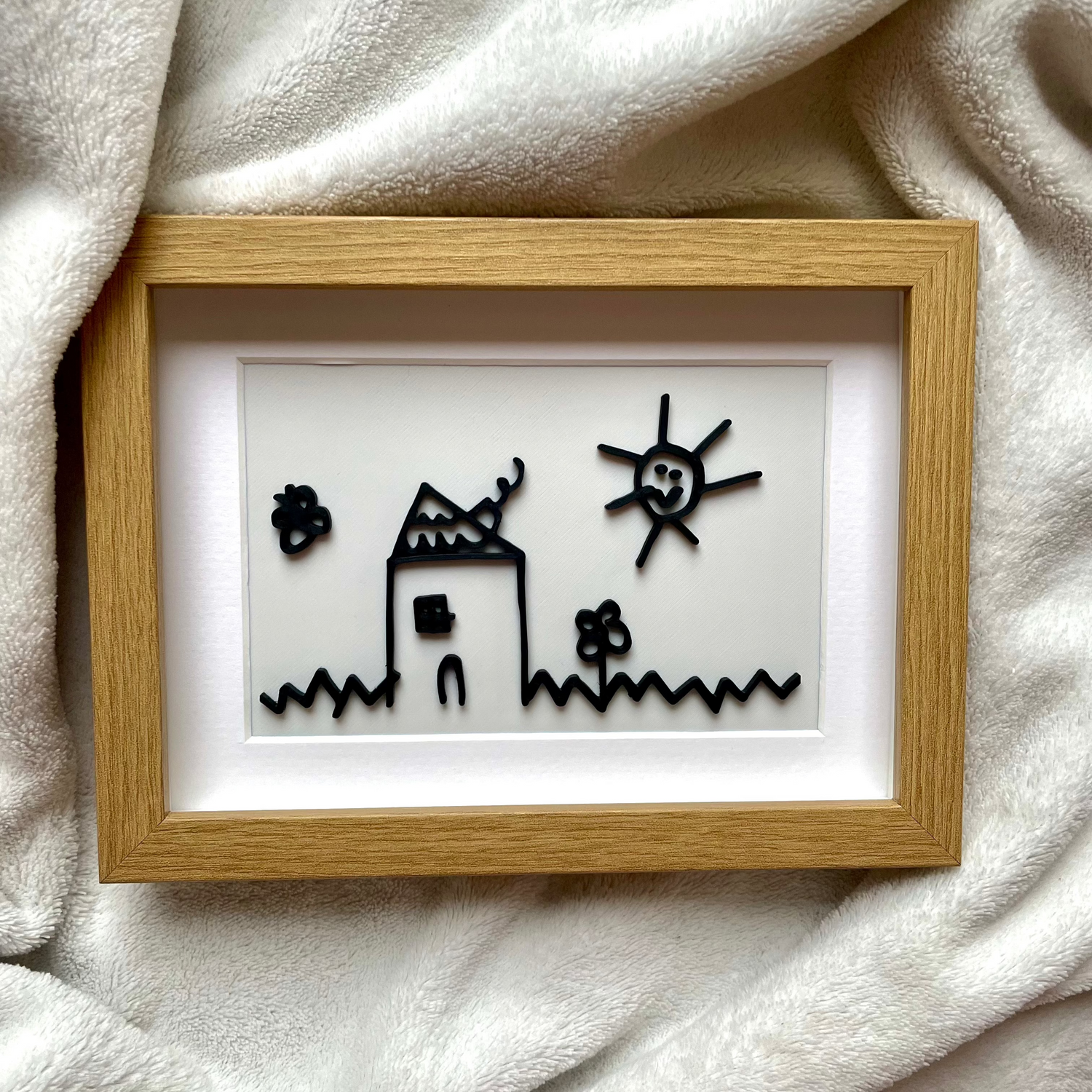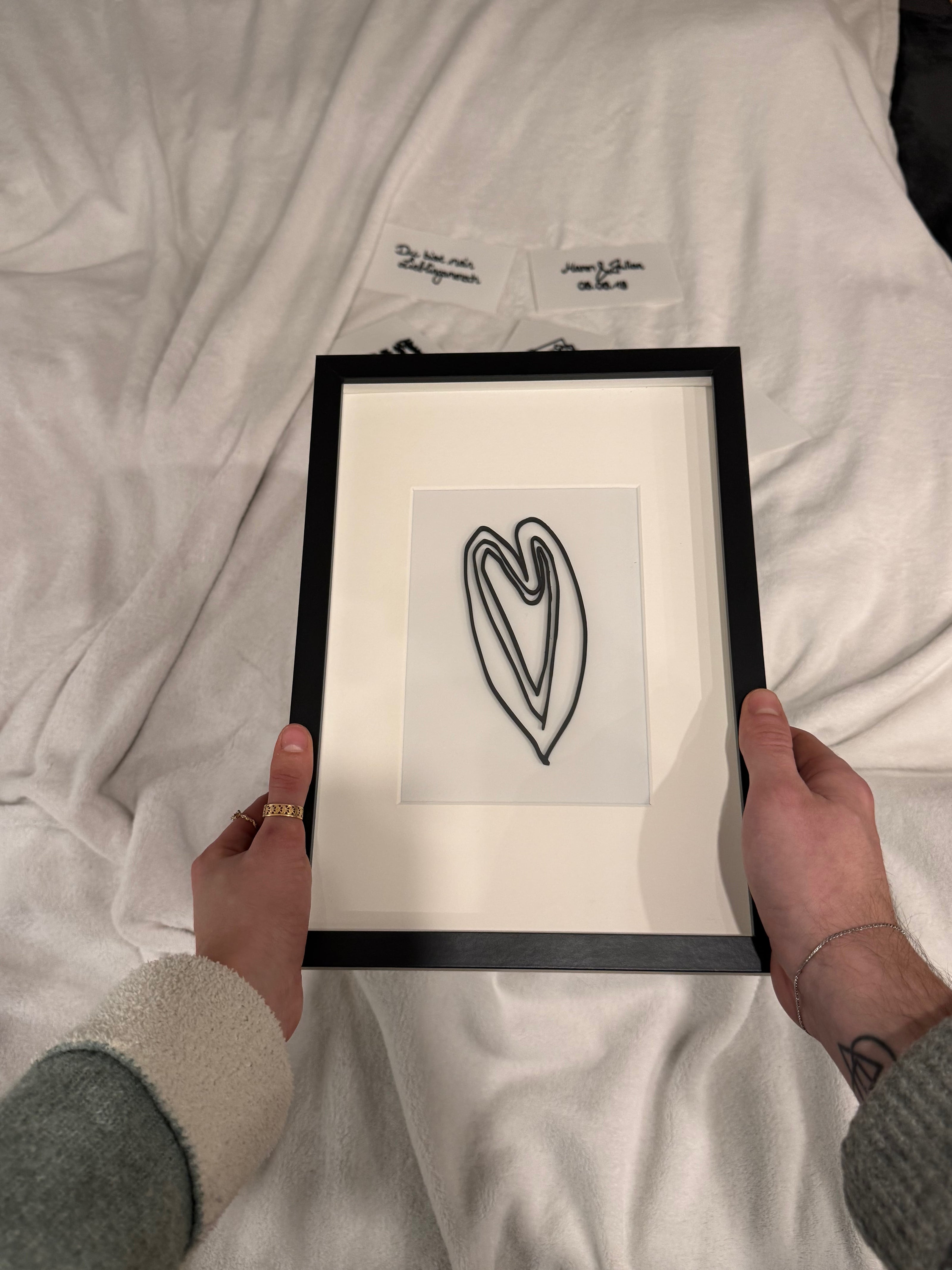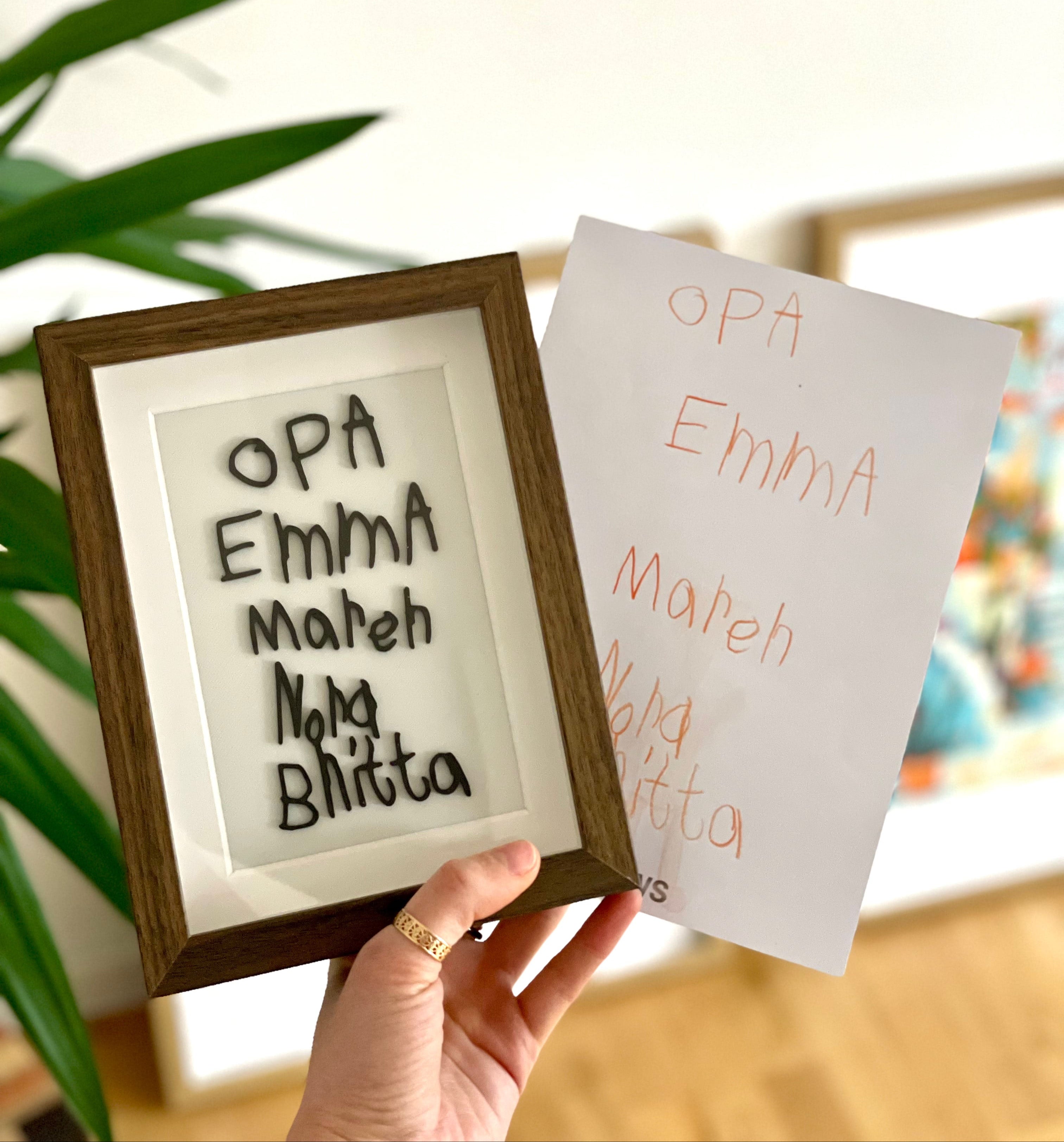 Zunächst wählst du die Rahmengröße und -farbe aus und schließt die Bestellung ab. Anschließend erhältst du von uns eine E-Mail mit einer Druckvorlage als Hilfestellung, die du auf einem DIN-A4-Papier ausdrucken kannst. In der eingezeichneten Kritzelbox kannst du dein persönliches Design mit einem dicken Filzstift erstellen. Danach fotografierst oder scannst du dein Werk und sendest es uns zurück. Wenn dein Werk auf einem alten Brief, einer Skizze oder einem weniger gut lesbaren Dokument basiert, bereiten wir es kostenfrei für dich auf. Schicke uns einfach alles, was wir hierfür brauchen, per Mail. Wir bearbeiten dein Kunstwerk, bereiten es in einer 3D-Software auf und starten den Druckprozess.